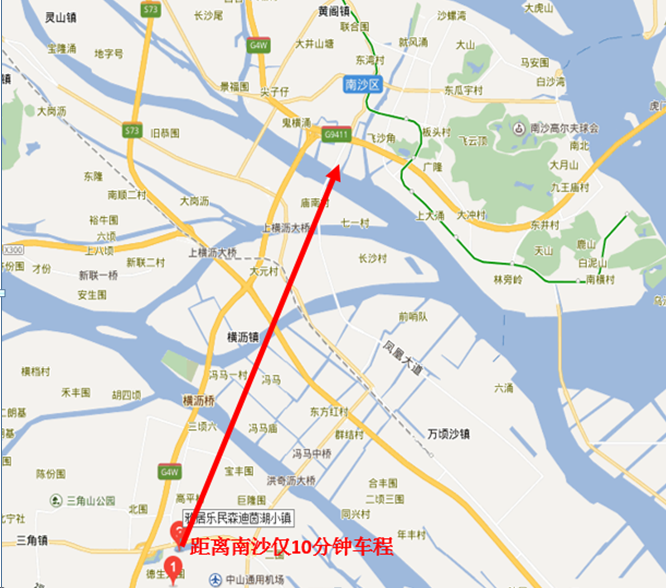 雅居乐民森迪茵湖小镇,位于中山市广澳高速三角收费站出口,距离南沙仅10分钟车程。凤凰一桥开通后,从雅居乐民森迪茵湖小镇出发不走高速,亲测10分钟可达。