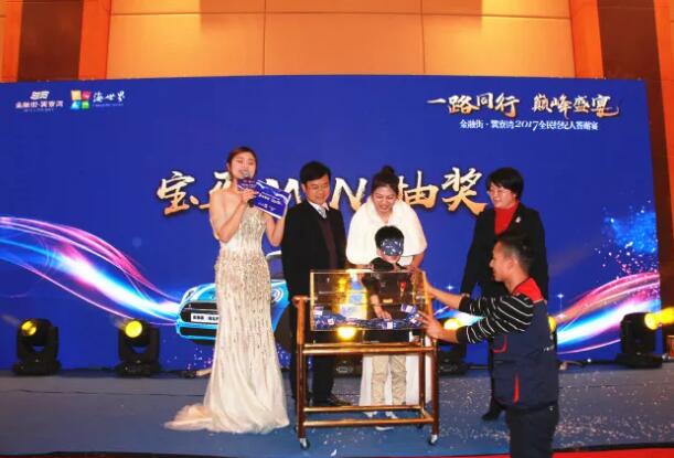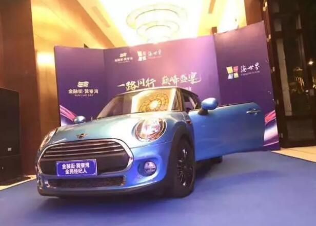 在宴会的后半部分,万众期待的宝马抽奖终于到来。蓝色宝马MINI早已经展示在喜来登酒店宴会厅外。