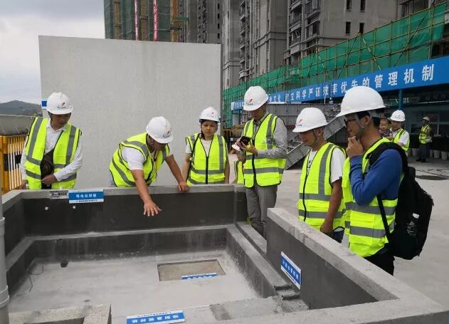 ▲ 工程师讲解同层排水技术,通过完善楼层截水系统,对施工用水和雨水进行有组织的拦截于引流,实现楼层干湿分区。