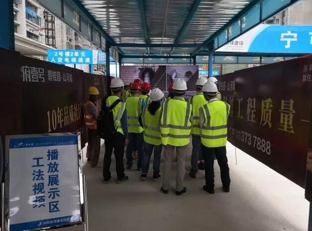 ▲ 在进入工地前,为确保业主们的安全,碧桂园工作人员为到场参观的每一位业主配戴安全帽,在工作人员引导下观看工法展示区。