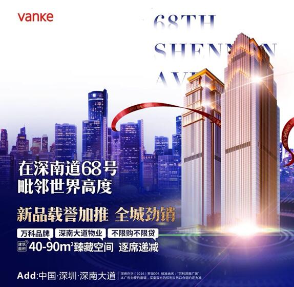 5月26日万科深南道68号加推少量臻品,万科深南道68号是万科在深南大道上打造的大型综合体项目,现加推约40-90㎡带精装修不占购房名额的稀缺单位,现售均价仅6万元左右。