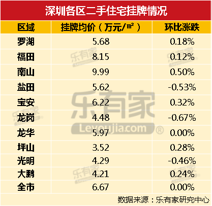 截止3月3日,全市二手住宅挂牌均价6.67万元/㎡,与上周挂牌价持平。南山区挂牌均价仍最高,为9.99万元/㎡,环比上涨0.5%;全市挂牌价最低的是坪山区,3.52万元/㎡,有0.28%的微幅上涨。其中,宝安和南山二手住宅报价持续上升,其他区域报价均呈下滑状态。其中盐田二手住宅报价下滑1.15%,跌幅最大。