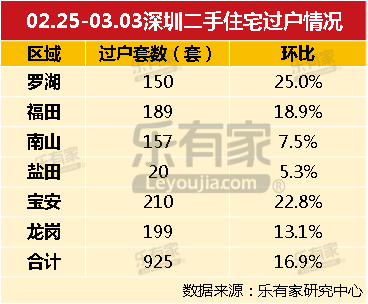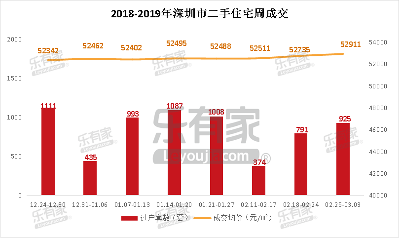 二手房方面,上周(02.25-03.03)深圳二手住宅过户925套,环比上涨16.94%;成交均价52911元/㎡,环比上涨0.33%。