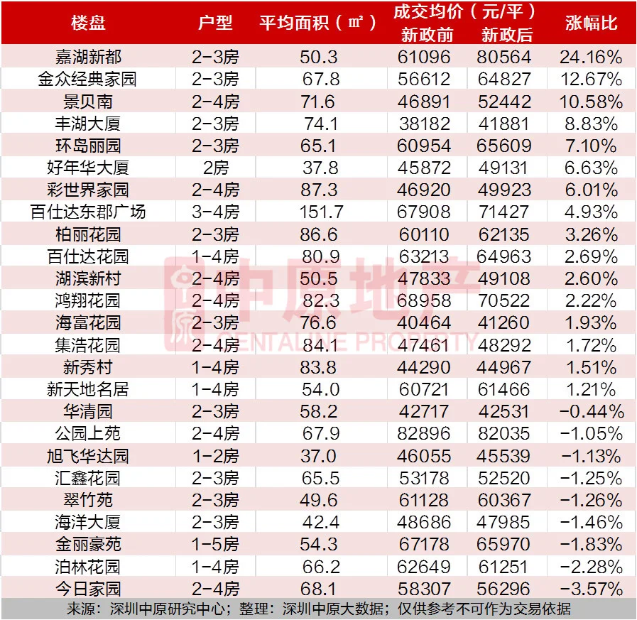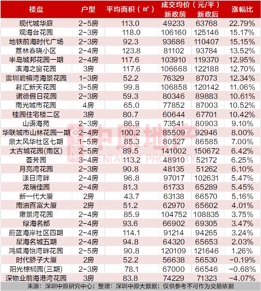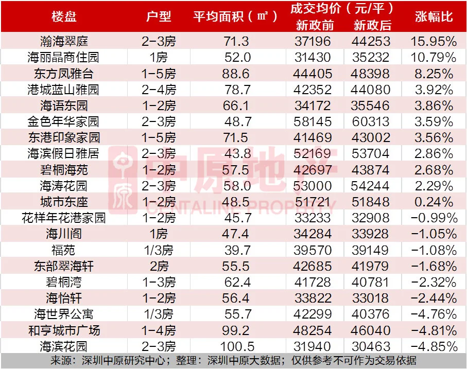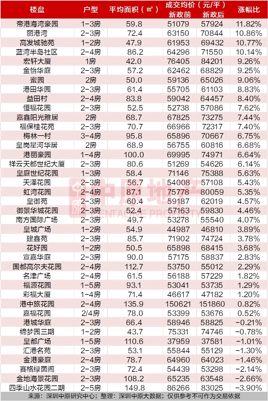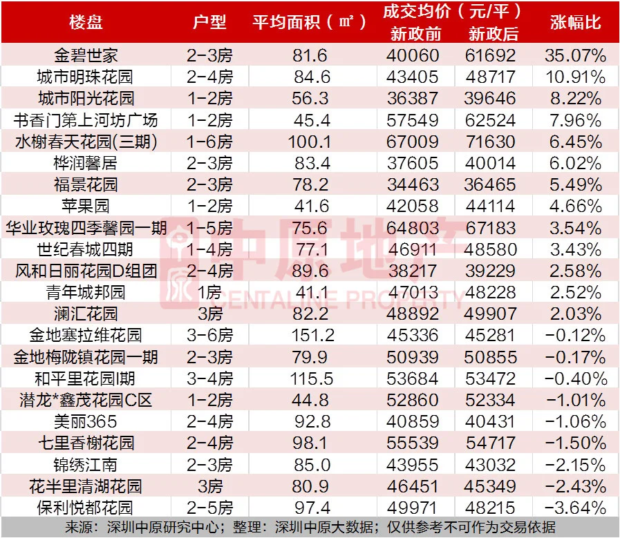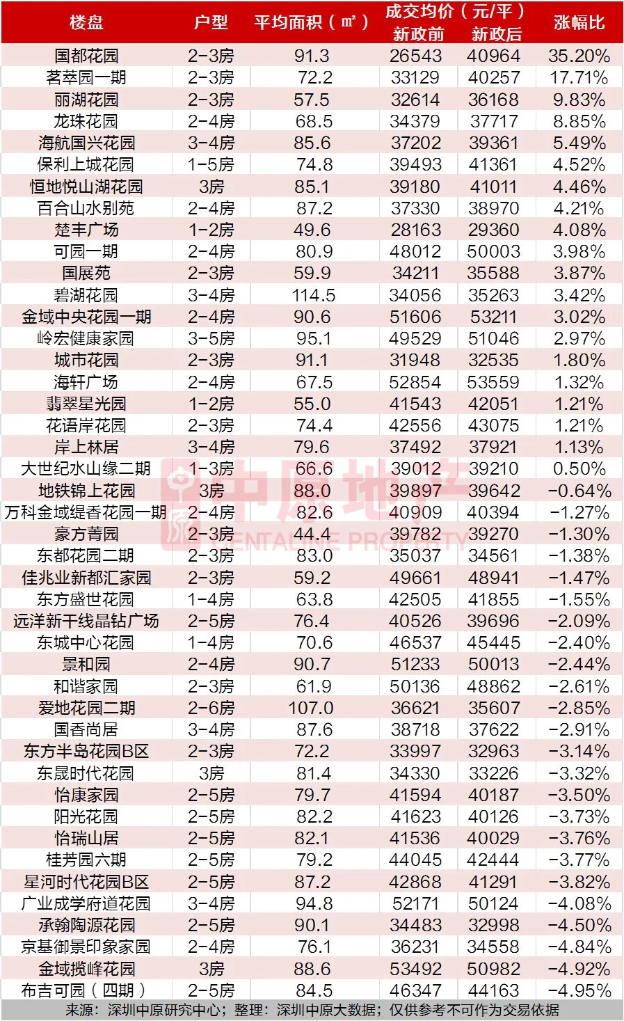 看过深圳半年的整体表现,那楼盘的具体表现又如何呢?本期『据说』还整理了各区热门成交二手楼盘新政前后的变化,(新政前:2017.8.1—2018.7.31;新政后2018.8.1—2019.7.31)的房屋均价对比。
