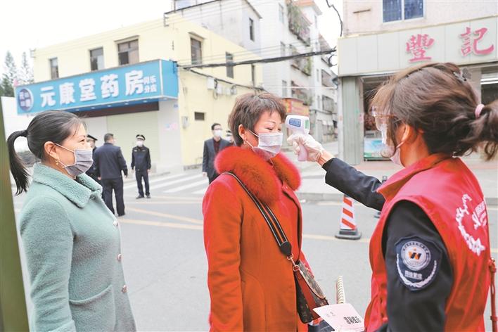 工作人员在给居民检测体温。 深圳特区报记者 李忠 摄