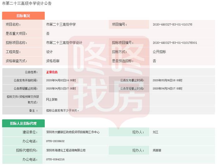 近日(4月2日),位于大鹏中心区的深圳市第二十三高级中学设计和深汕合作区深汕合作区赤石片区的深汕高级中学发布方案设计及建筑专业初步设计招标公告。
