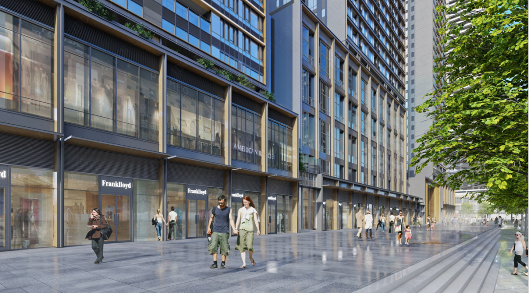 转角处还设置了一个时尚商业前广场,回应现代都市生活需求,人们可以通过一系列不同的景观设施汇聚成的都市聚会目的地、网红打卡地来表达展现他们自己。