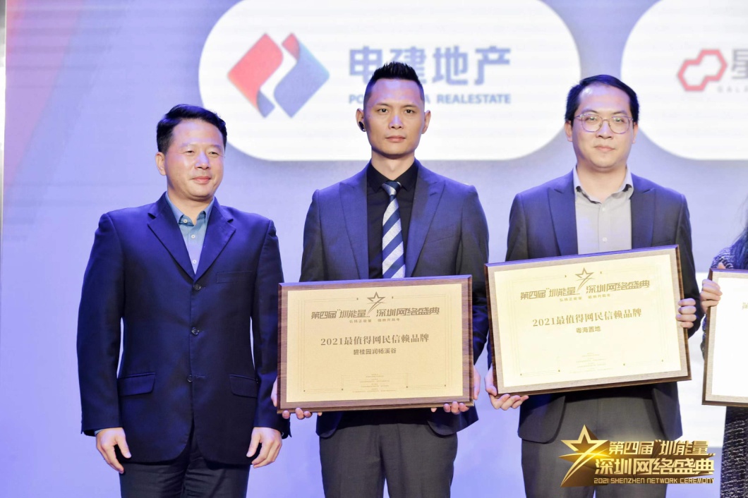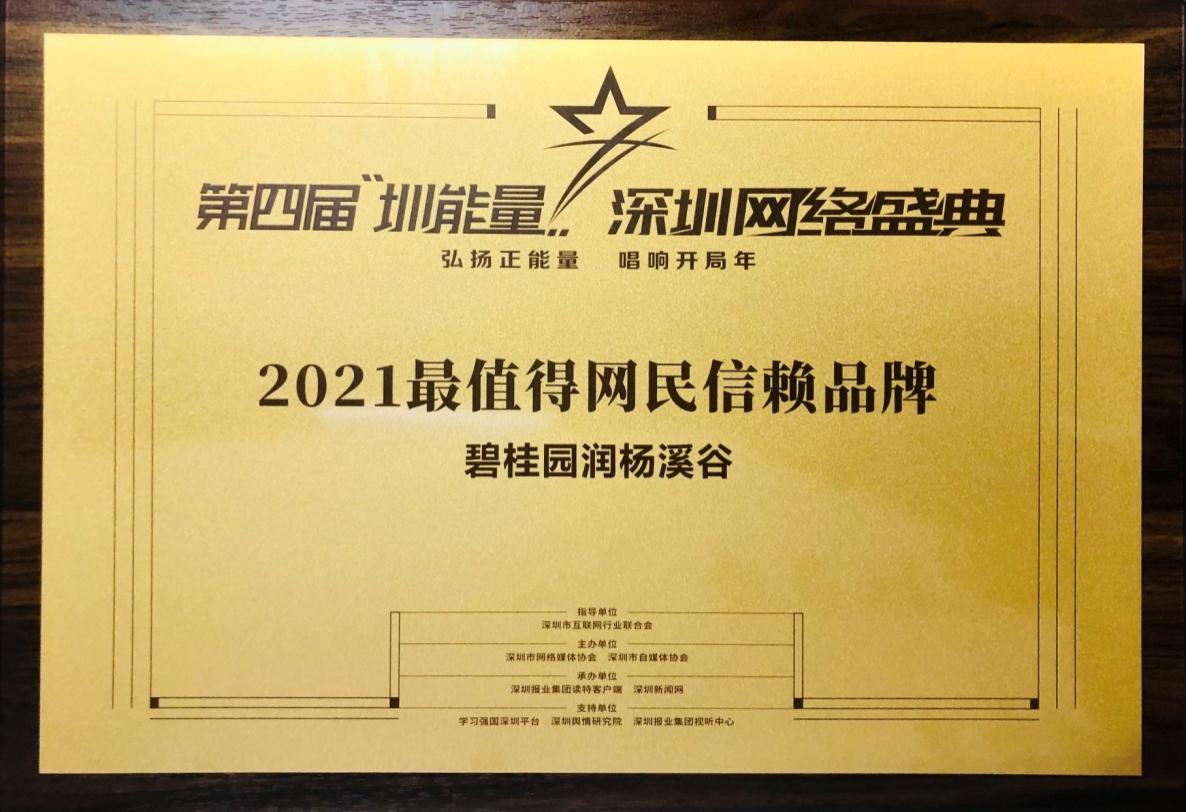 其中,碧桂园润杨溪谷以其品质卓越的人居产品、温泉宜居的生活方式理念,荣获2021深圳网络盛典“最值得网民信赖品牌”称号。碧桂园润杨溪谷营销负责人宋林帆代表该项目上台领奖。