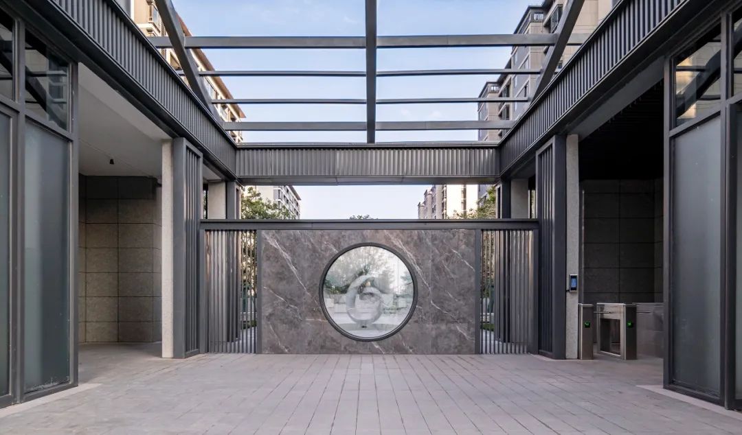 二进入口大门,可见岭南传统“凹斗门”式空间意向门头,两侧横贯,堂中设通透屏门,延续中国传统宅院入门设计,彰显府门礼序。