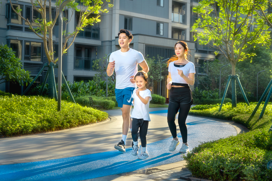 约660m微汗跑道全社区环绕,灵动蓝徜徉着蓬勃的生命力,与车行道区分互不干扰,满足车行便利也确保运动安全,周末的清晨,换上运动装备,在跑道上迎着新生的朝阳奔跑,开启元气满格的一天。