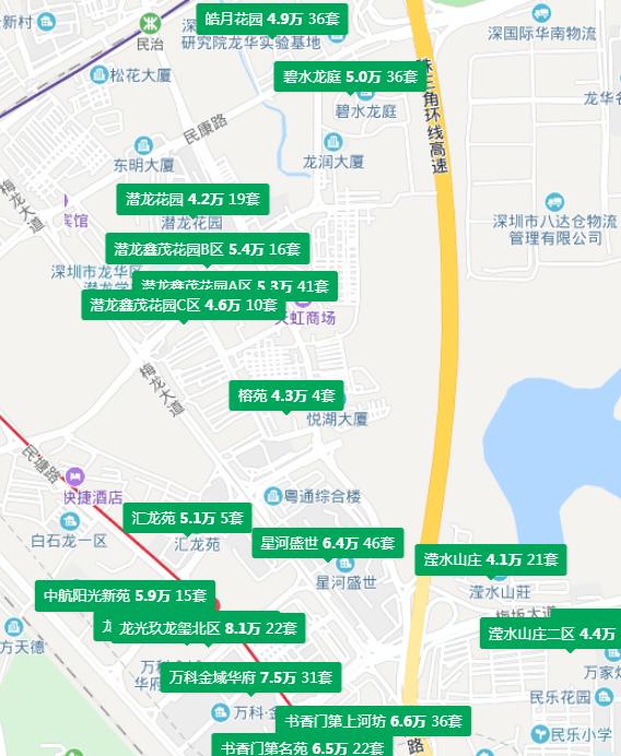 目前,周边次新盘是星河盛世,2013年入伙,二手房报价6.5-7.5万/㎡。还有2006年入伙的潜龙鑫茂花园,目前均价4.5-5.5万/㎡,2009年入伙碧水龙庭均价5万/㎡。 白石龙地铁口附近的万科金域华府, 龙光玖龙玺 均价在 6.5 万— 8万/㎡。