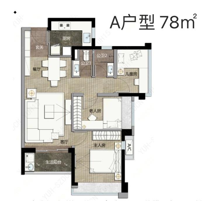 2.小三房、三房户型比较适合刚需、刚改。无赠送, 78 ㎡户型紧凑,儿童房有点局促。户型整体的收纳不错。