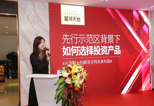 随后,星河地产深圳公司营销总监王小丹女士上台致欢迎辞,重点阐述了星河的品牌实力,与布局湾区的精准眼光,以城市运营先行者的姿态,助推区域繁荣。目前,选址于光明的星河天地项目,更是备受市场关注,人气及成交量持续火爆。