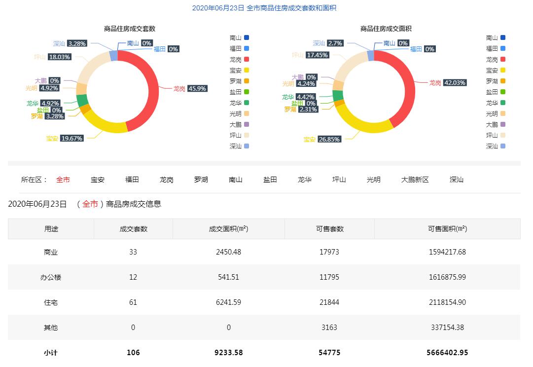 每日成交数据:6月23日深圳市商品住宅共成交61套。