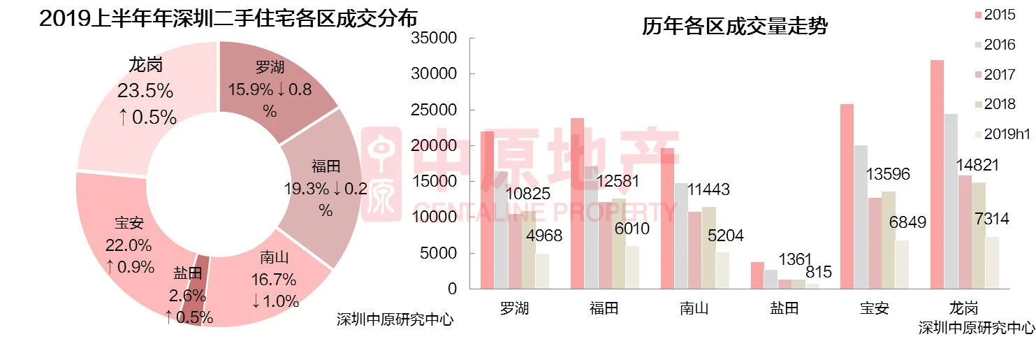 2019年上半年全市二手住宅共成交31160套,面积约256.4万平。从上半年的区域分布来看,龙岗成交占比最高,其次为宝安,两区占比都超过两成。