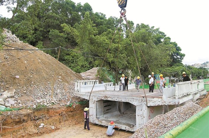 ▲桥梁拆除废弃物循环利用道路拼接安装现场。 深圳市住房和建设局供图