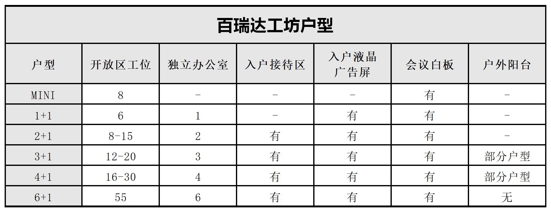 “百瑞达工坊”目前已精装修面积近万平米,层高4.8m。500㎡公共区域包括智能视频会议室、水吧、休闲区域,配备密码、指纹打卡智能门禁系统,会议室智能预约系统,24小时中央空调新风系统。户型方正,大小组合灵活。采光好,连通户外阳台。每个房间均为豪华精装,配置全新办公家俬。首创一体式租赁模式,让企业轻松入驻。从一人工位到多人工位均可选择,面积任选、工位灵活组合,800元/月起价格优惠,200平方米以上更可提供个性化定制装修服务。