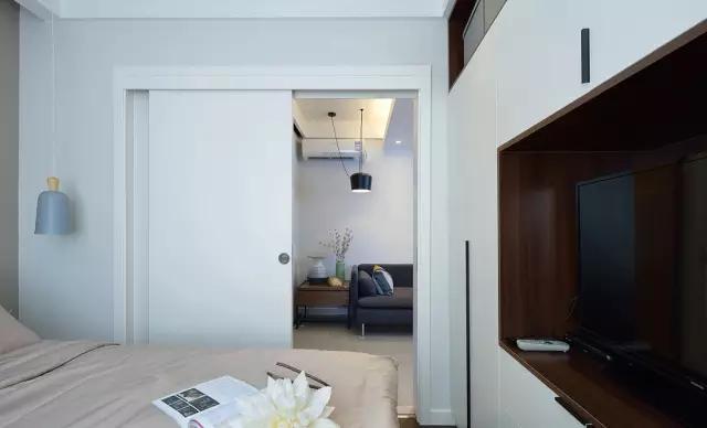 电视背景墙旁是通向主卧的推拉门,这种款式的门相对不占用空间,也能让整个空间显得更为宽阔。