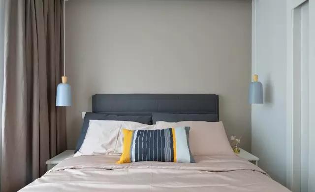 【主卧】吊下的床头灯轻灵简洁,床头柜的设计细看非常实用,刚好可以配合插座使用。