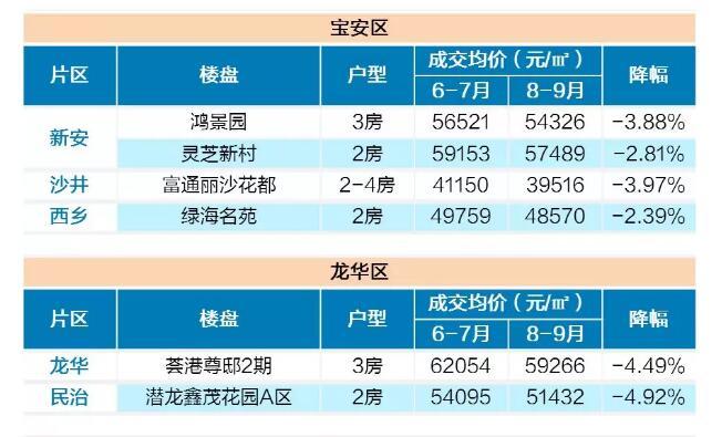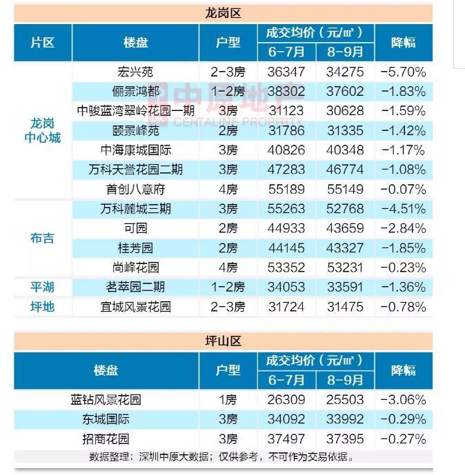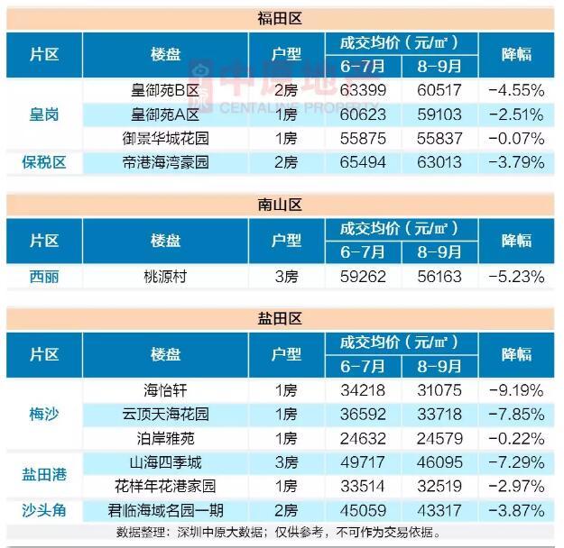 楼盘降幅较大的是盐田区,在下表所列举的样本楼盘中,有一半降幅超过5%,从上文的图二也可看到该区在6-8月维持了连续三个月的价格下跌,不过在9月倒是逆势而上成为唯一价格上涨的区域。