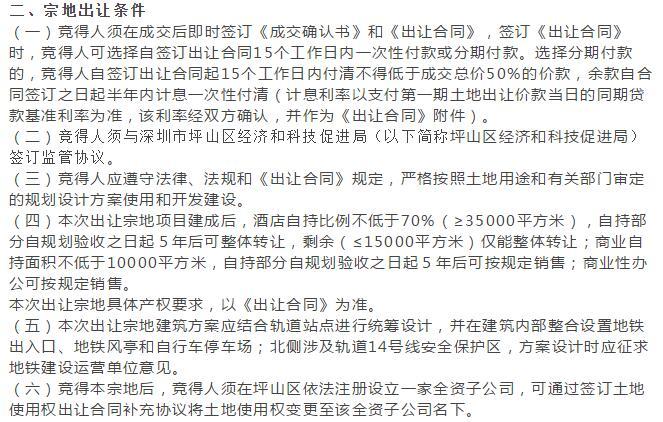 根据宗地出让条件,本次出让宗地项目建成后,酒店自持比例不低于70%(≥35000平方米),自持部分自规划验收之日起5年后可整体转让,剩余(≤15000平方米)仅能整体转让;商业自持面积不低于10000平方米,自持部分自规划验收之日起5年后可按规定销售;商业性办公可按规定销售。