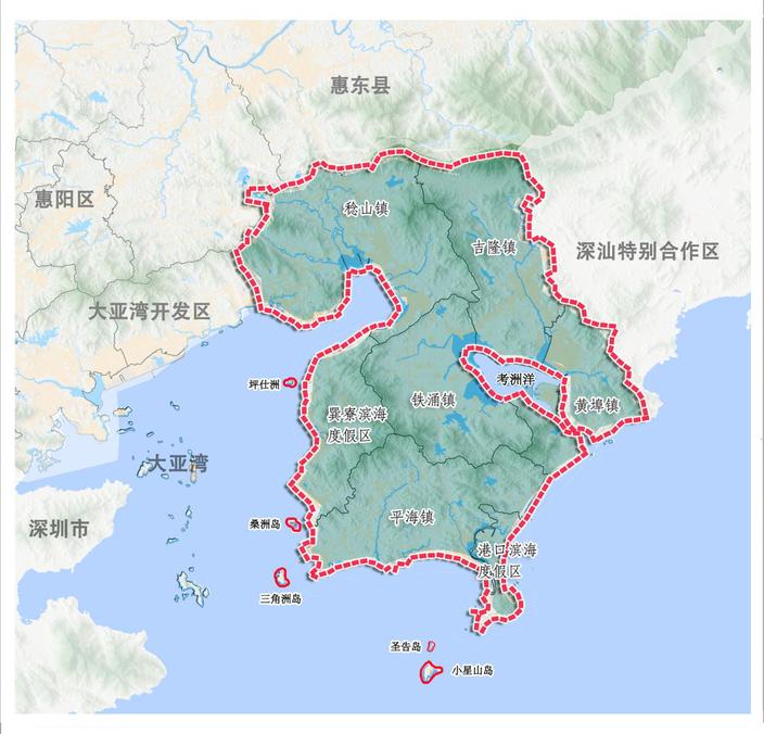 公示稿显示,稔平半岛位于惠东县东部沿海,由稔山、吉隆、黄埠、铁涌、平海5个镇和巽寮、港口2个滨海旅游度假区组成,陆域面积755.7平方公里,海域面积3200平方公里,海岸线218公里。