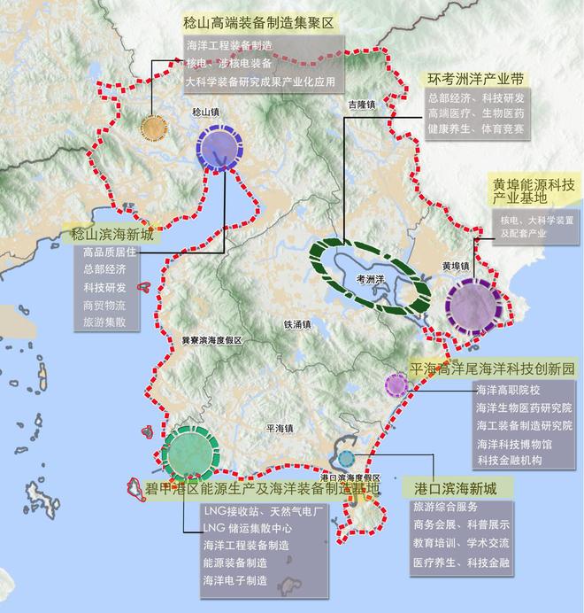 稔山高端装备制造集聚区、稔山滨海新城、环考洲洋产业带、黄埠能源科技产业基地、平海高洋尾海洋科技创新园、港口滨海新城